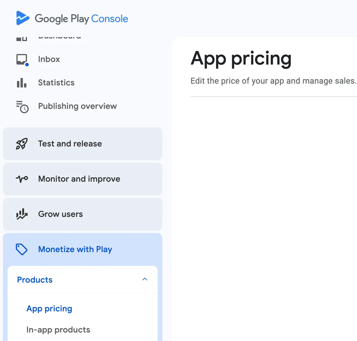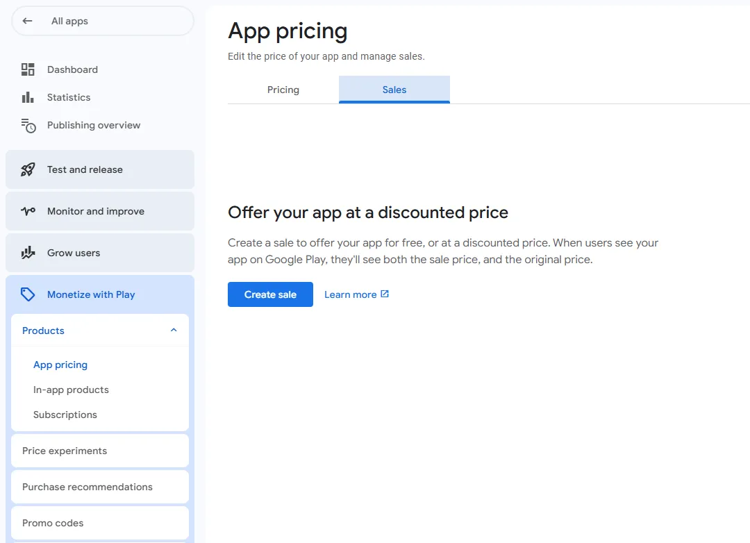- From the left-hand menu, go to Monetize with Play → Products → App Pricing.